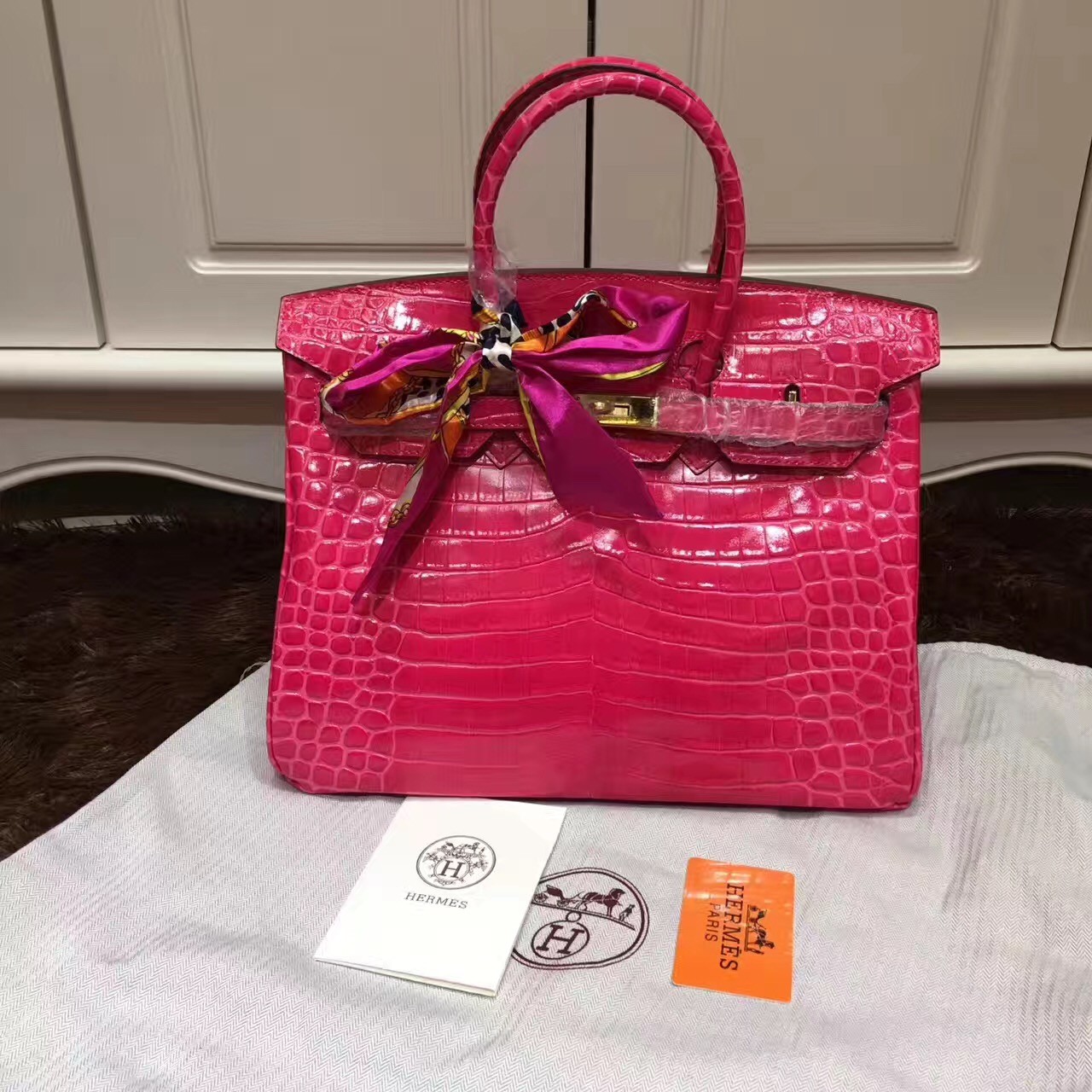 Viene con cerradura, llaves, tarjeta Hermes, bolsa para polvo Hermes.