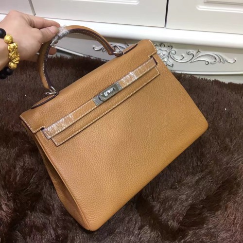 Hermes Kelly 32cm Togo cuero 6108 café claro plata