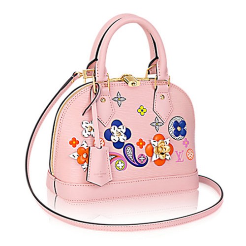 Este Alma BB combina colores vibrantes con parches de cuero elaborados para brindar una interpretación femenina y fresca de la icónica flor Monogram de Louis Vuitton.