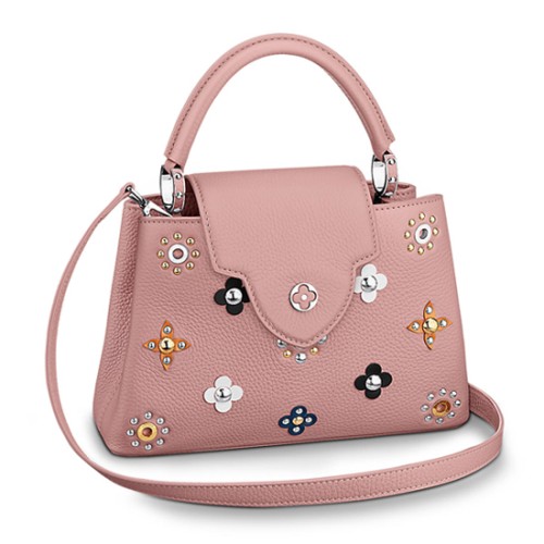 Descripción: El bolso Capucines BB Mechanical Flowers en color Magnolia reinterpreta el icónico Monogram Flowers en una versión moderna para un estilo audaz. Las tachuelas metálicas representan los corazones de las flores y le dan un toque rockero. También recuerdan a los clavos que se usaban para tensar el lienzo Monogram en los históricos baúles de Louis Vuitton. Esta delicada animación combina diferentes universos y códigos de la Maison con una estética femenina. (Largo x Alto x Ancho)